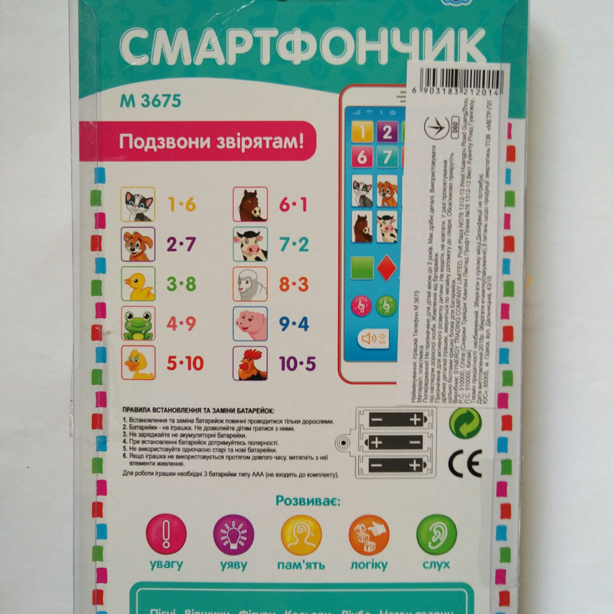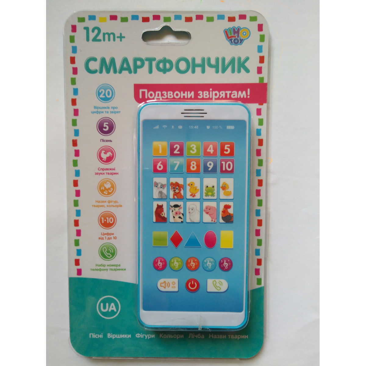 Перший смартфон М3675 — чудовий телефон, який допоможе познайомити дитину з назвами тварин українською мовою. Телефон співає веселі пісеньки, що легко запам“ятовуються українською мовою.