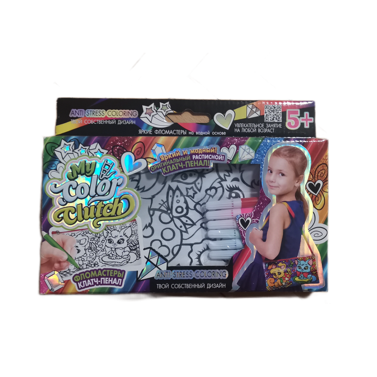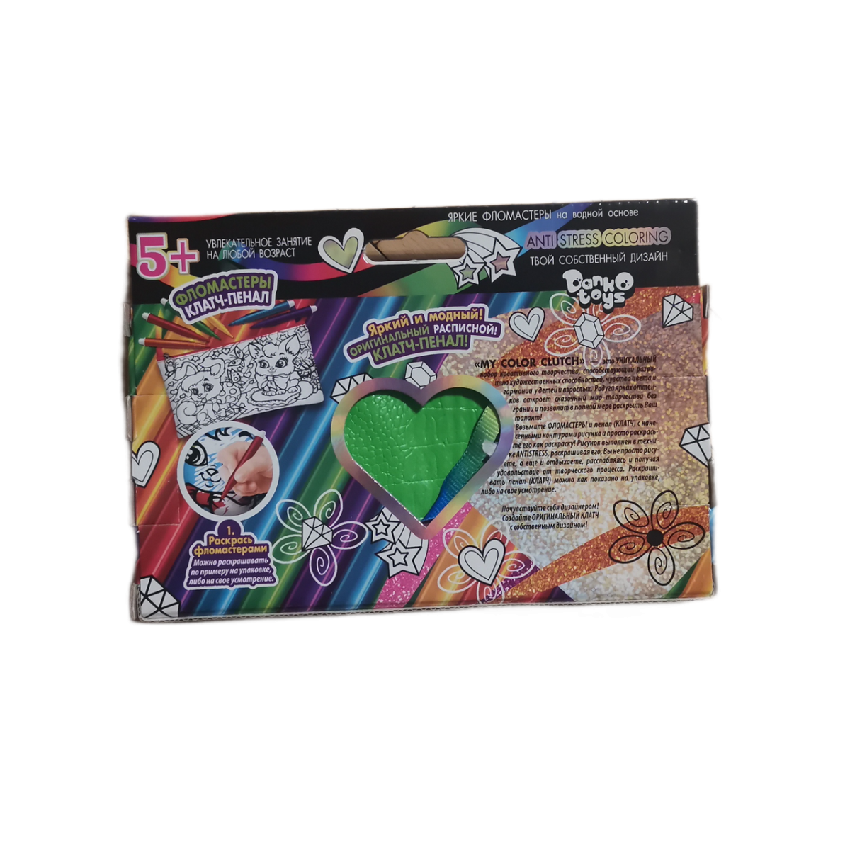 «MY COLOR CLUTCH» — це УНІКАЛЬНИЙ набір креативної творчості, що сприяє розвитку художніх здібностей, почуття кольору та гармонії в дітей і дорослих. Веселка яскравих відтінків у поєднанні з сяйним блиском відкриє казковий світ творчості без меж і дасть змогу повною мірою розкрити Ваш талант! Візьміть фарби та пенал із нанесеними контурами малюнка і просто розфарбуйте його як забарвлення! Розфарбовувати пенал можна як показано на пакованні або на свій розсуд. А додавши ГЛІТТЕР в акриловий ЛАК, Ви зможете декорувати будь-які зафарбовані елементи на малюнку, надаючи СЯЮВАЛЬНИЙ БЛЕСК своєму творінню. Відчуйте себе дизайнером! Створіть ОРИГІНАЛЬНИЙ КЛАТЧ із власним дизайном!