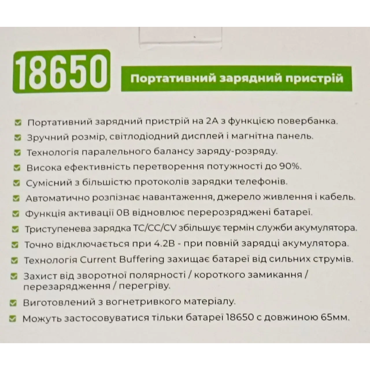 - Вихід: LI-ion DC - 4,2 В/ 2*1000 мА/1*2000mAh