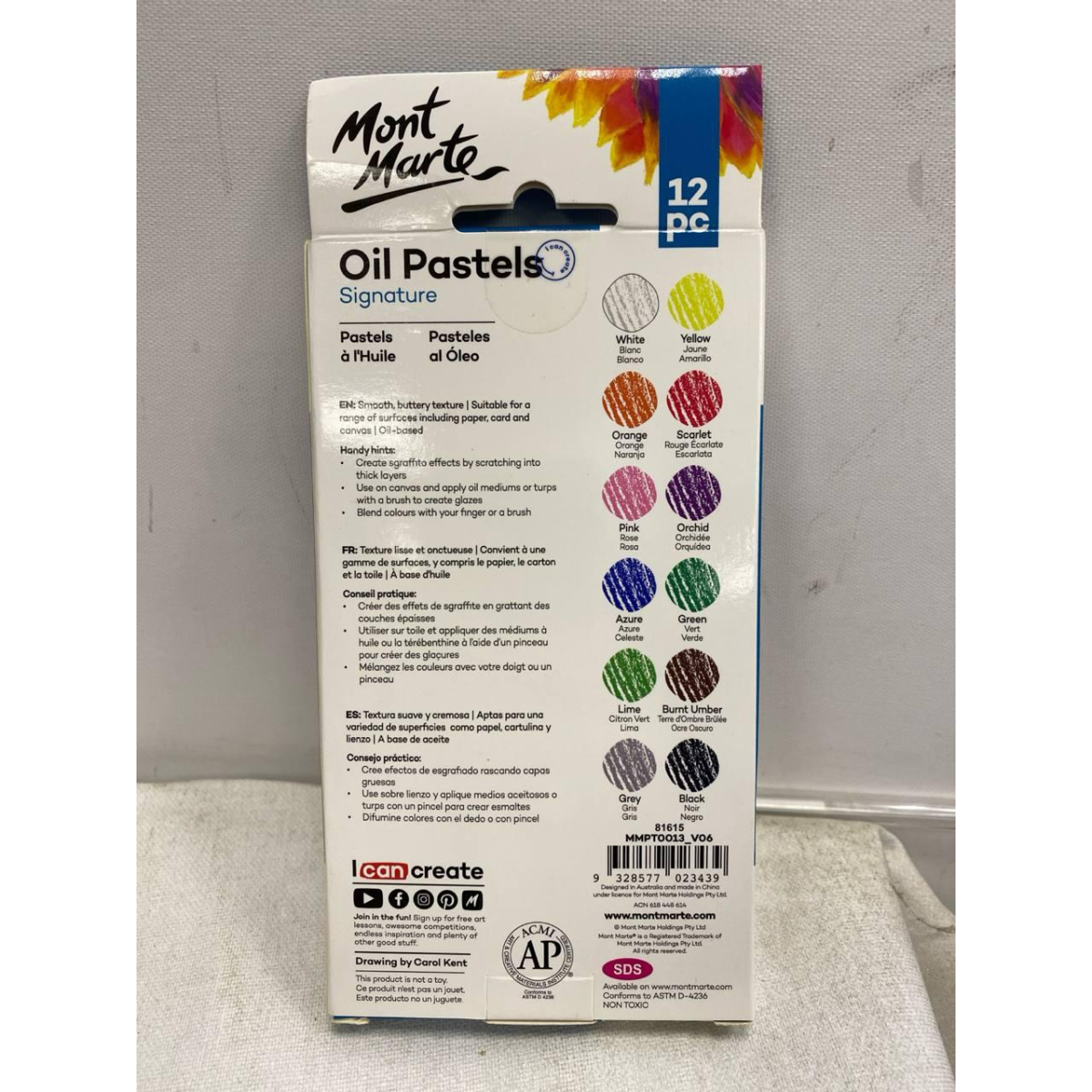 Пастель олійна Mont Marte - це професійні кольорові матеріали для малювання з м“якою маслянистою текстурою. Пастель вирізняється насиченістю кольорів і чудово підходить для змішування, даючи змогу створювати виразні відтінки на різноманітних тонованих і текстурованих поверхнях. Ідеально підходить для техніки «sgraffito», де за допомогою продряпування шарів можна створювати унікальні дизайни та візерунки. Пастель також можна тонувати з використанням олійних медіумів або скипидару для створення ефекту глазурі. Характеристики: 12 високоякісних пігментів М“яка, масляниста текстура Легкість змішування Нетоксичний склад Підходить для використання масел та акворелі Mont Marte