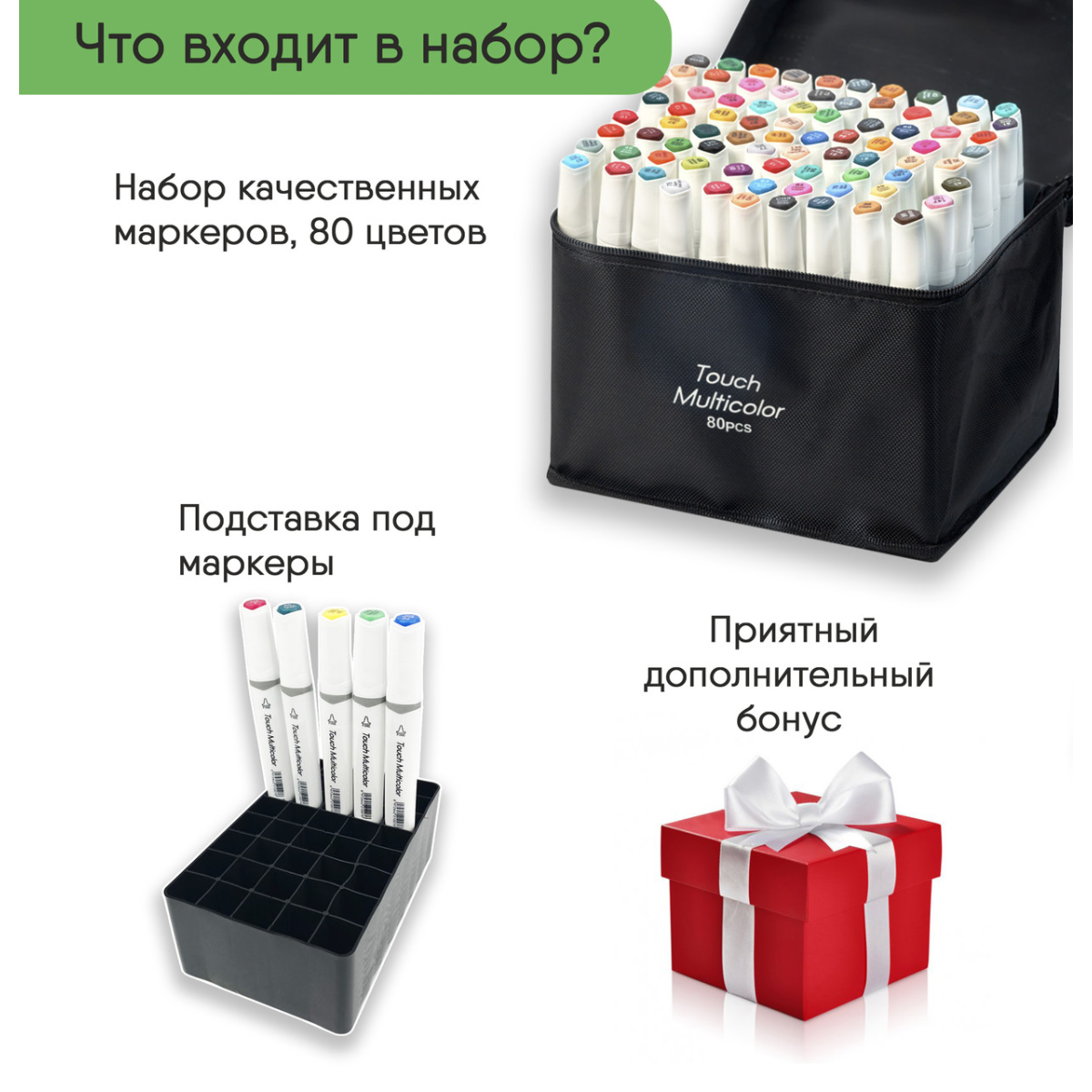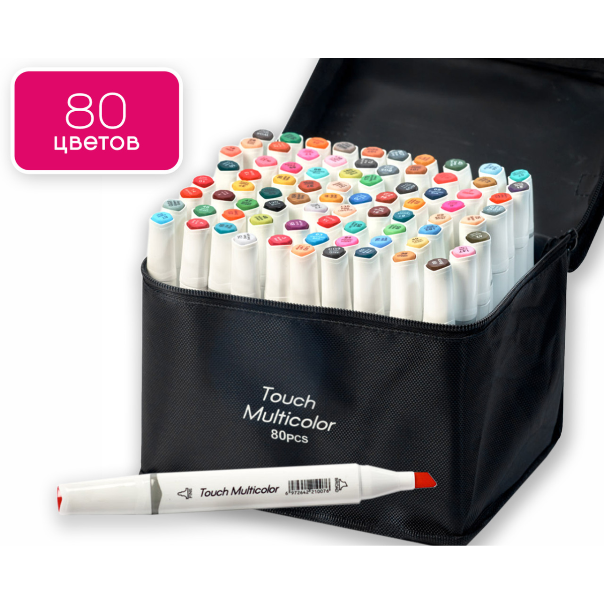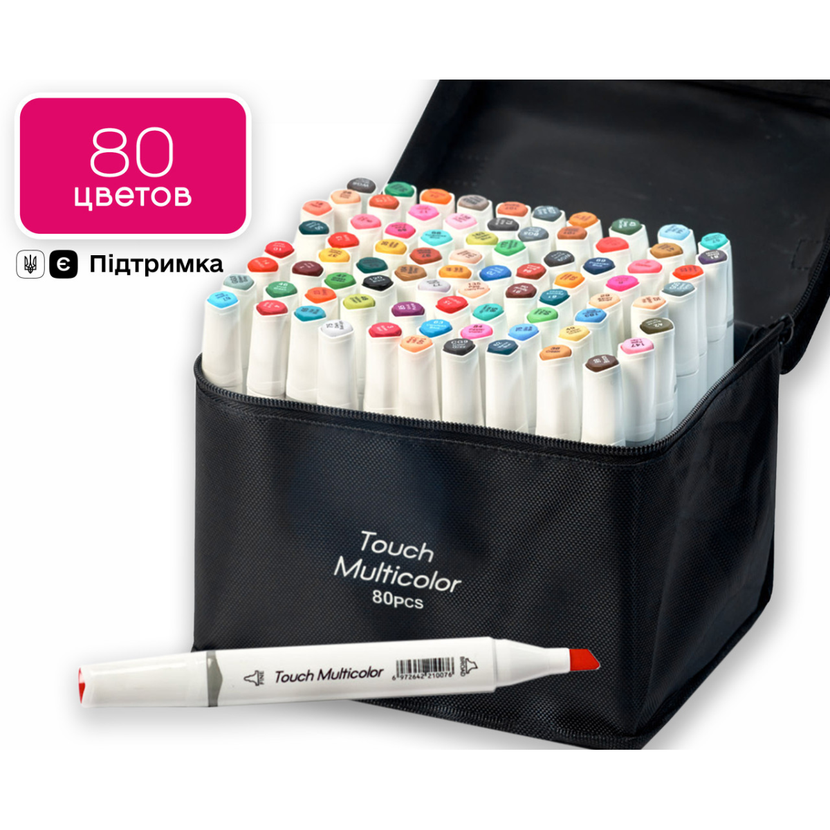 Спиртові маркери Touch для тих, хто захоплюється малюванням і каліграфією, любить створювати комікси і мальовничі ескізи. У наборі 80 маркерів різних кольорів. Корпус пластиковий, гладкий. Ковпачки щільно закриваються. Кожен маркер має два наконечника різної форми для різного типу робіт. Загострений наконечник для тонких ліній і контурів. Плоский наконечник зі скошеним краєм для широких штрихів. Для зручності розпізнавання типу пера кінці маркерів пофарбовані різними кольорами. Кожен колір має свій цифровий код, який нанесений на ковпачок маркера. Чорнило на спиртовій основі добре вбираються в папір, тому рекомендується використовувати щільні листи або картон. Кольори добре змішуються між собою, плавний перехід відтінків. Хороший вибір відтінків для шкіри людини Довжина маркера 16,8 см.