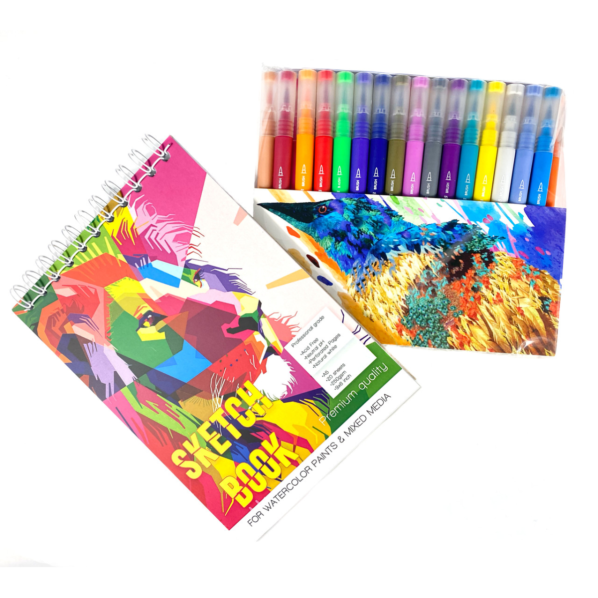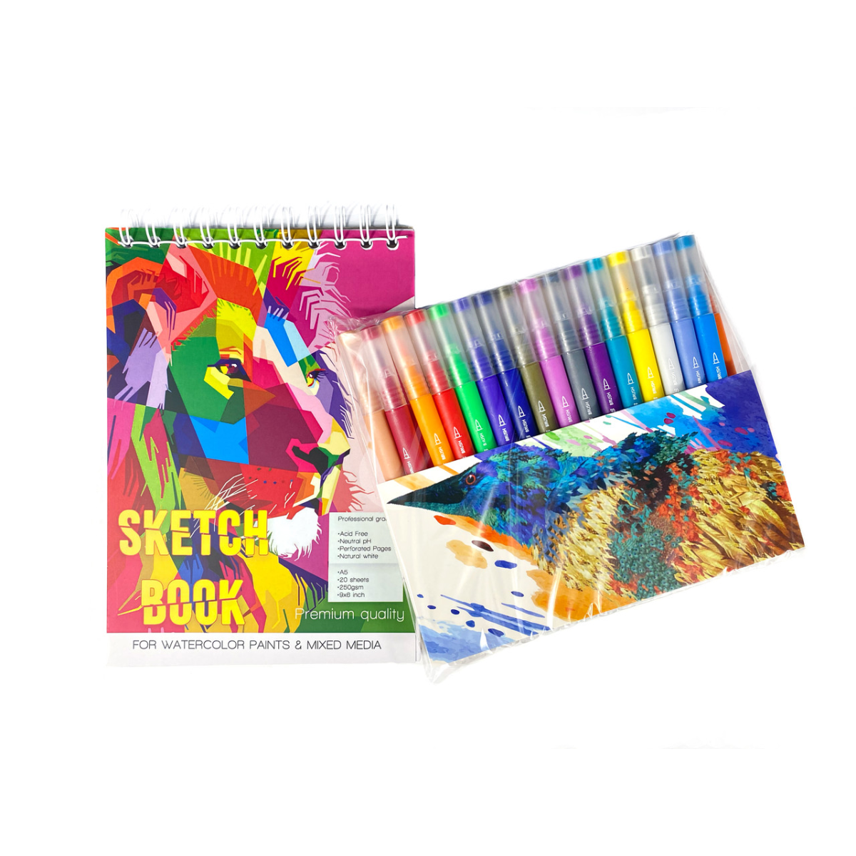 Brush Markers Pens - це маркер нового покоління з удосконаленими характеристиками та новими можливостями у використанні! Чорнило маркера на водній основі мають високопробний та насичений пігмент. Має зручний стрижень у формі пензля та лінеру (лайнера), що дозволяє наносити не тільки найдрібніші деталі візерунків, але й зафарбовувати великі частини малюнків, створювати каліграфічні написи. Пензель - маркер (Brush Pen) ідеально підійде для акварелістів, ілюстраторів, графіків, дизайнерів та просто любителів живопису та креативу. Альбом із 20 листів щільністю 250 г/м2. Альбом на спіральці призначений для малювання. Цей папір забезпечує комфортне малювання, оскільки маркери не розтікаються та не передруковуються. Це найкращий варіант для подарунка як художнику-початківцю або любителю, так і для профі!
