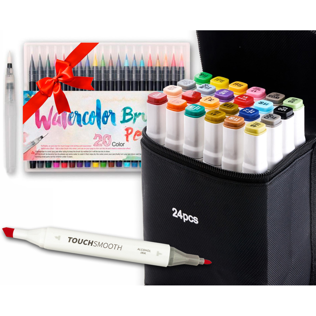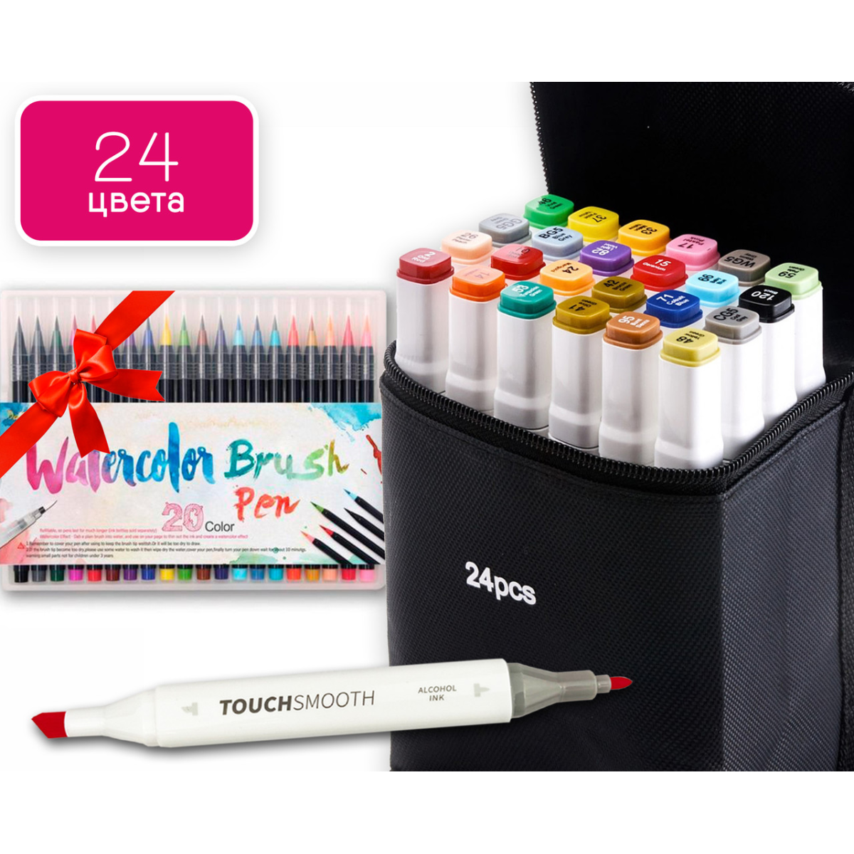 Набір для скетчів, скетч маркери Touch Smooth на спиртовій основі 24 шт + 20шт акварельних маркерів з пензлем