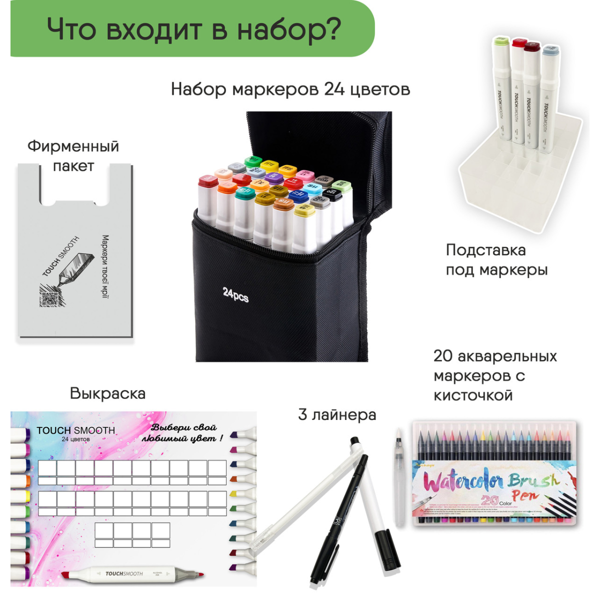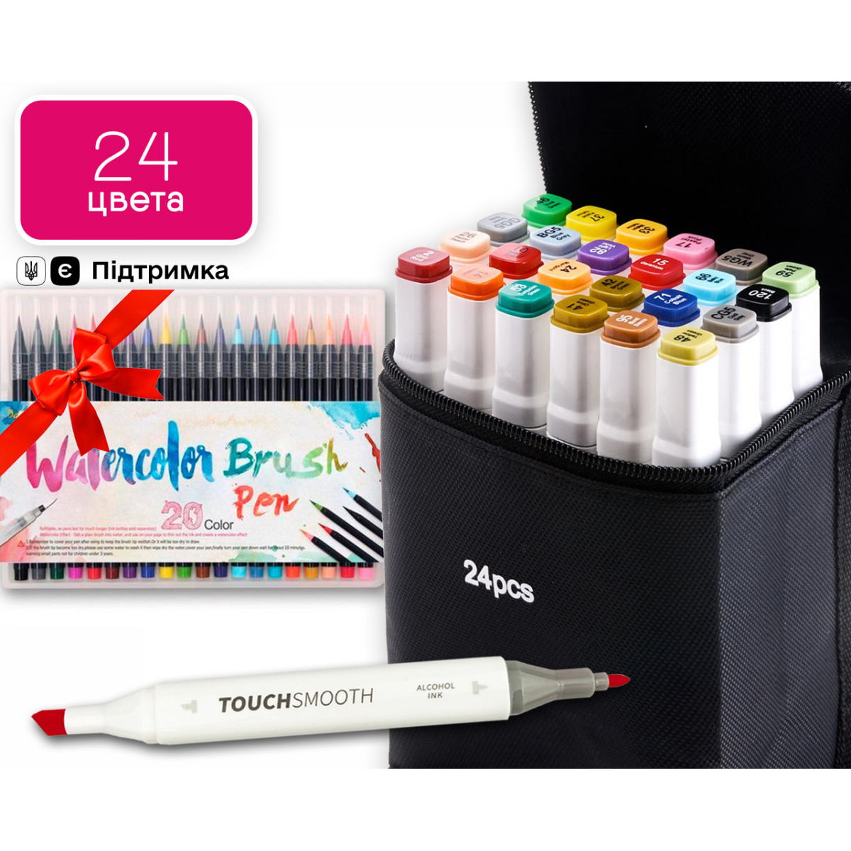 Маркери Тач смус Арт - кращий варіант представлений на українському ринку! Сертифікований продукт, повний комплект. Купуючи наші маркери Ви отримуєте не тільки самі високоякісні маркери, з найбільшим наповненням чорнила, але і так само : Підставку під кожен маркер Вимальовку для кожного кольору Вашого Набору Три лайнера , два чорного кольору і блікову ручку Брендований пакет, для того що б маркери завжди були з Вами І солодкий бонус від нашого магазину, для натхнення ☺️ Сертифіковані маркери найкращої якості, з повним комплектом ! СПЕЦІАЛЬНА ПРОПОЗИЦІЯ! Ви купуєте Набір двосторонніх маркерів Touch Smooth для скетчинга на спиртовій основі 24 шт і разом з ними отримуєте Набір акварельних маркерів Water Color Brush маркер - пензлик 20 кольорів Набір двосторонніх маркерів Touch Smooth для скетчинга на спиртовій основі 24 штук У наборі 24 маркерів різних кольорів. Корпус пластиковий, гладкий. Ковпачки щільно закриваються. Кожен маркер має два наконечника різної форми для різного типу робіт. Загострений наконечник для тонких ліній і контурів. Плоский наконечник зі скошеним краєм для широких штрихів. Для зручності розпізнавання типу пера кінці маркерів пофарбовані різними кольорами. Кожен колір має свій цифровий код, який нанесений на ковпачок маркера. Чорнило на спиртовій основі добре вбираються в папір, тому рекомендується використовувати щільні листи або картон. Кольори добре змішуються між собою, плавний перехід відтінків. Хороший вибір відтінків для шкіри людини Довжина маркера 16,8 см. Корпус маркерів і чорнило виготовлені з сертифікованих матеріалів і повністю безпечні як для дітей, так і дорослих. Набір акварельних маркерів Water Color Brush маркер - пензлик 20 кольорів В набір для малювання входять маркери з акварельною фарбою (палітра з 20 відтінків) + пензлик з порожнім баком для води. Чорнило в маркерах - це акварель високої якості, що дає можливість вільно працювати в акварельних або маркерних техніках. Фарба розмивається м“яко, без різких переходів. Чорнило на водній основі нагадують насичені акварельні фарби, тому кольори можна легко змішувати один з одним і ретушувати. Імітують акварель, чисті і зручні у використанні, можна легко застосовувати на відкритому повітрі і швидко створити робочу майстерню. Друга особливість цих чарівних маркерів - це пензлик. Він м“яко і плавно ковзає по папері, лінії немов самі вибудовуються так, як потрібно. Пензлик середній за розміром і стійкий до вигинів і “розпушування“. Маркери відрізняються насиченістю й чистими кольорами в оптимальному діапазоні 20-ти найбільш популярних відтінків. Відмінно підходять для малювання в традиційній техніці, при промальовуванні деталей, розфарбовуванні, а також каліграфії і тонкі, так і товсті лінії малюються дуже легко. Також ці маркери це прекрасна ідея для подарунка для маленьких художників!
