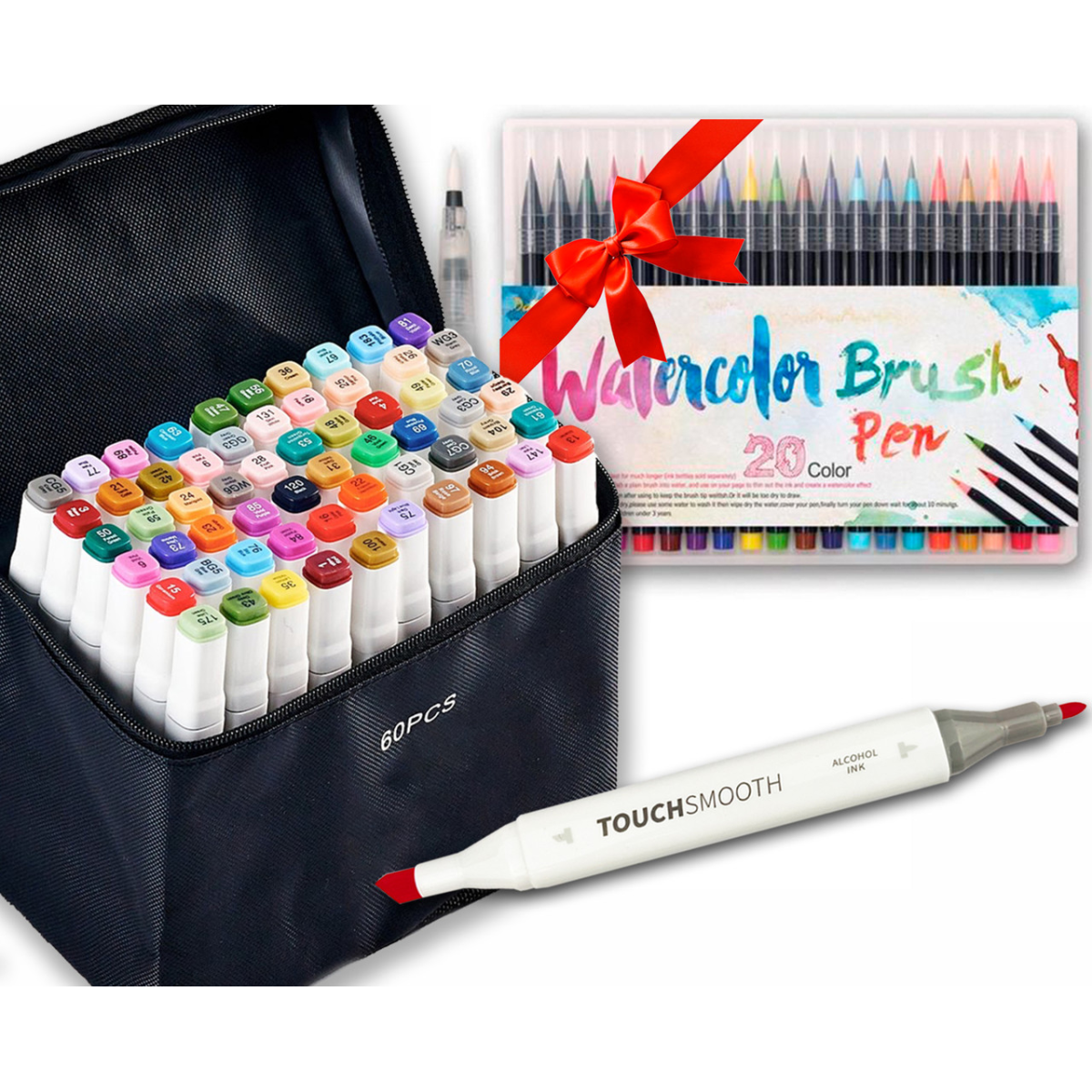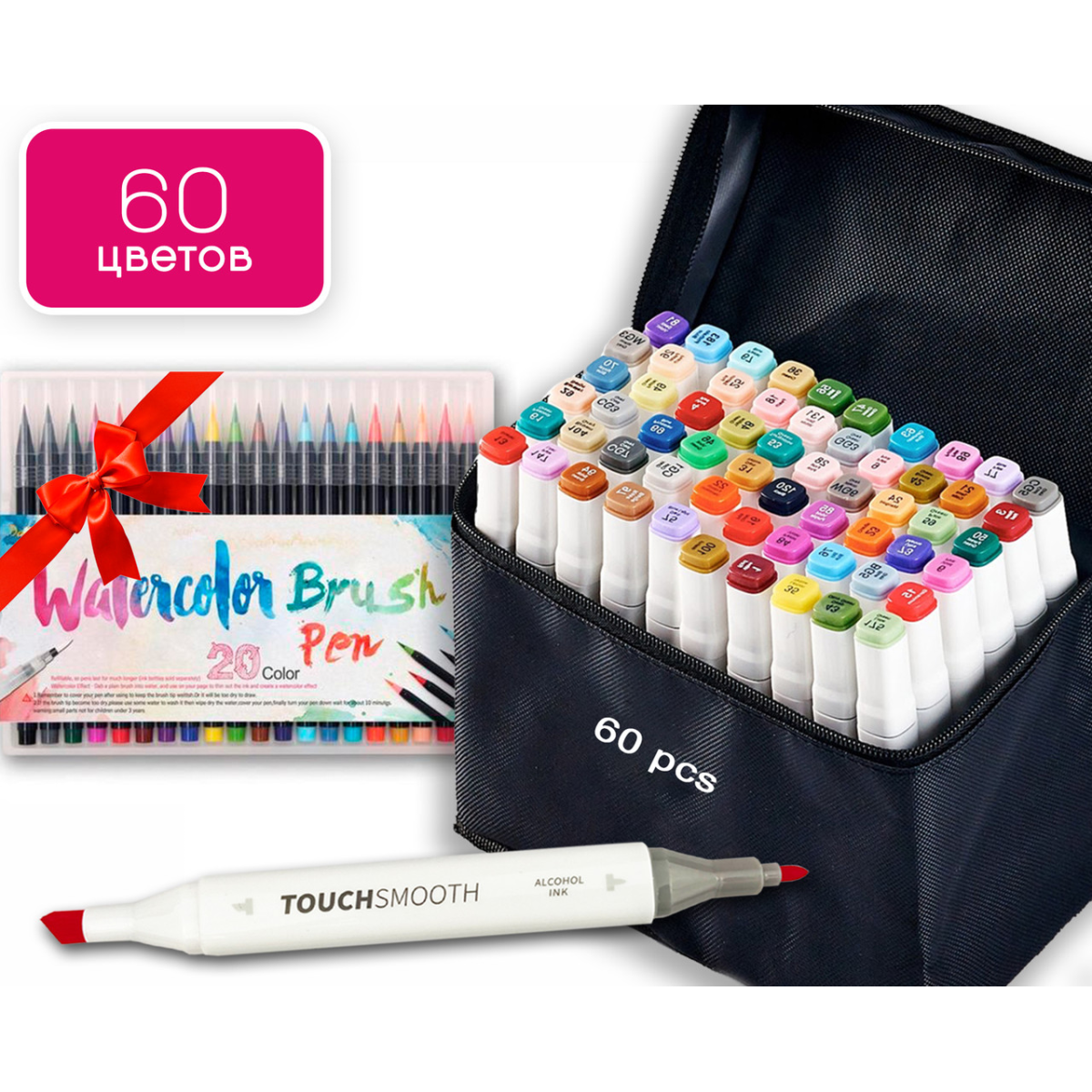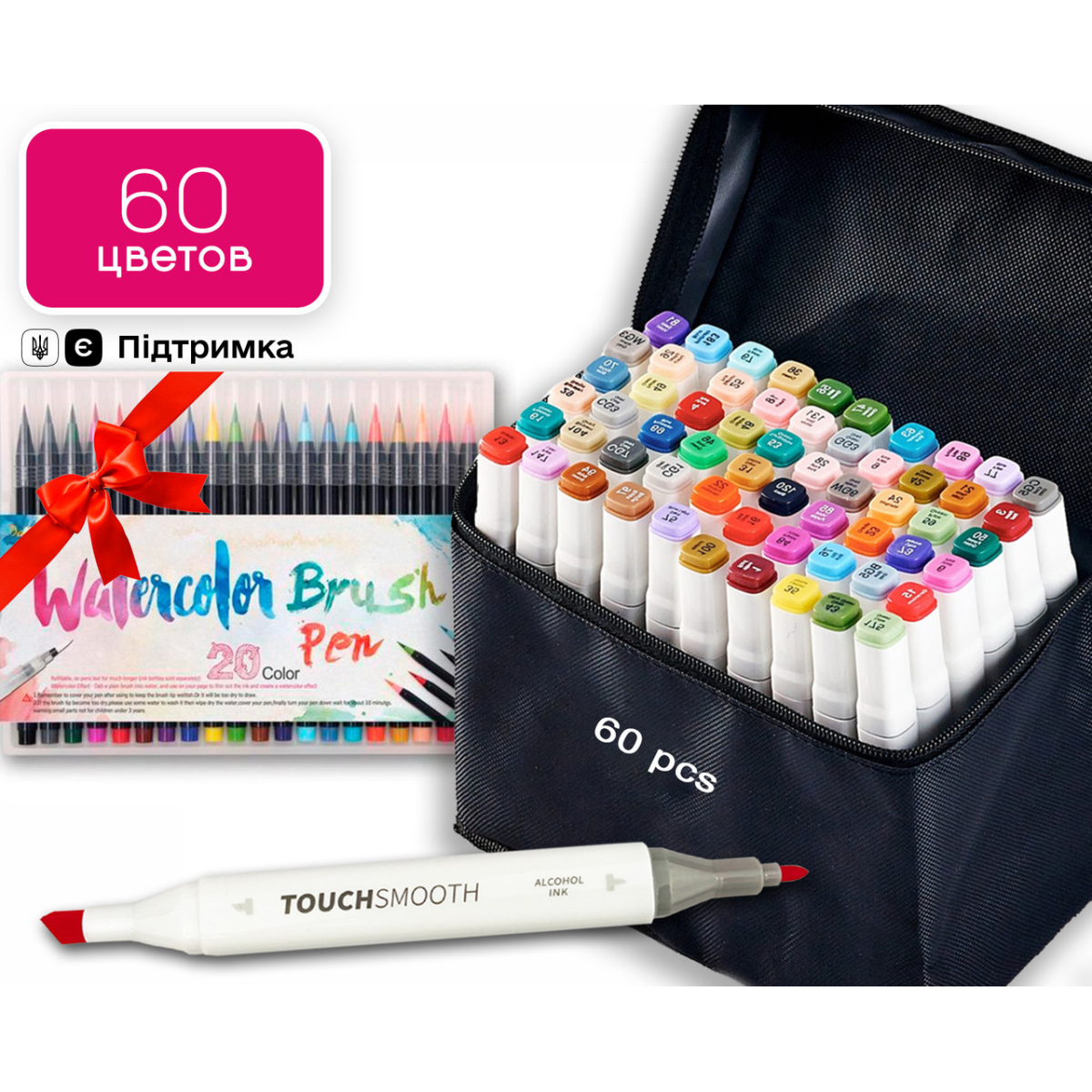 Ви купуєте Набір двосторонніх маркерів Touch Smooth для скетчинга на спиртовій основі 60 шт і разом з ними отримуєте Набір акварельних маркерів Water Color Brush маркер - пензлик 20 кольорів