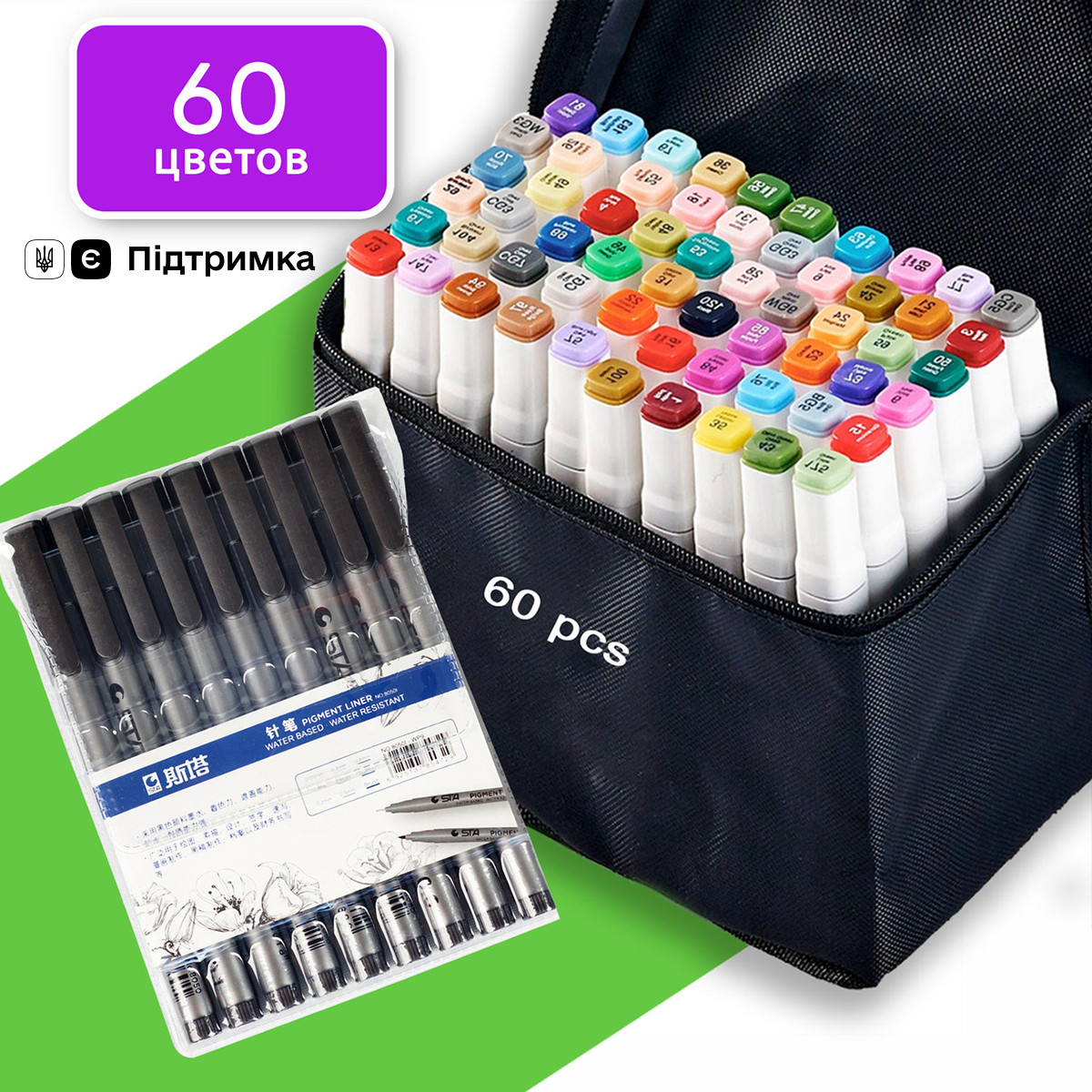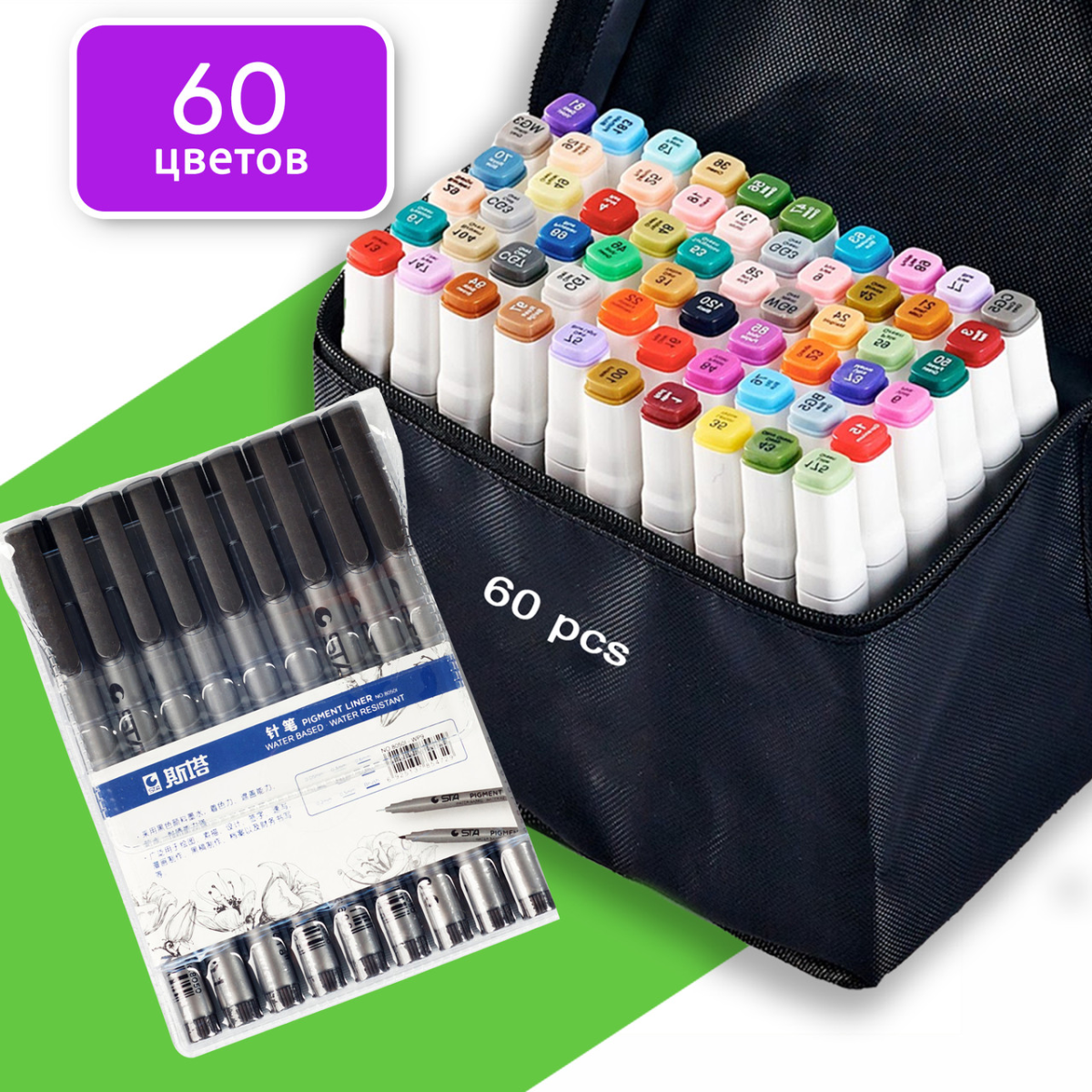 Маркери двосторонні Touch 60 кольорів і набір лайнерів 9 шт для ескізів і скетчів, набір фломастерів
