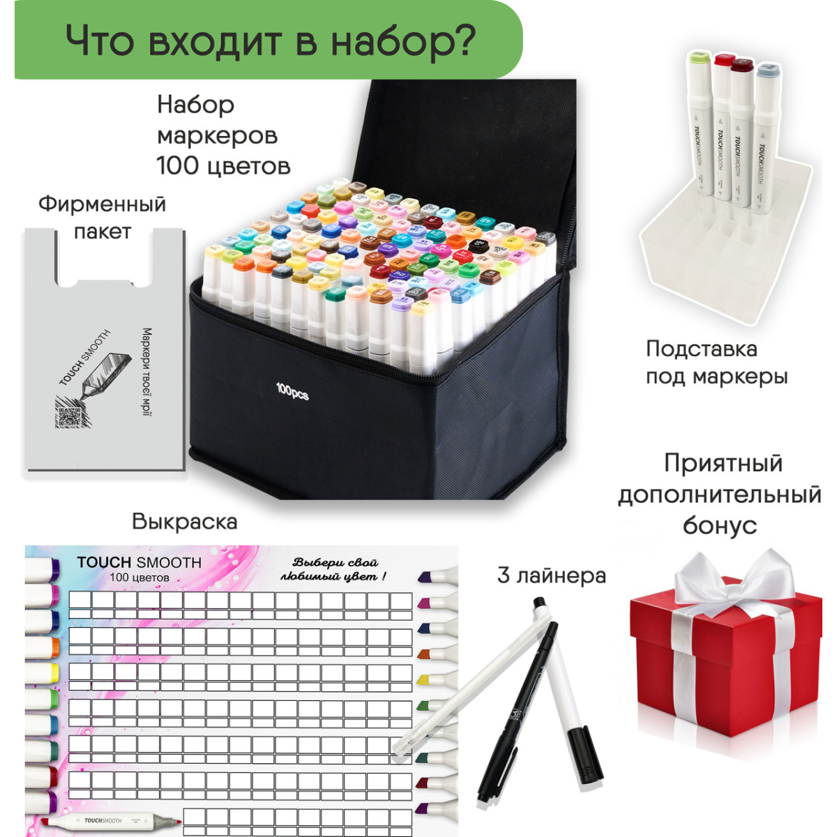 Маркери Тач смус Арт - кращий варіант представлений на українському ринку! Сертифікований продукт, повний комплект. Купуючи наші маркери Ви отримуєте не тільки самі високоякісні маркери, з найбільшим наповненням чорнила, але і так само: Підставку під кожен маркер Вимальовку для кожного кольору Вашого Набору Три лайнера , два чорного кольору і блікову ручку Брендований пакет, для того що б маркери завжди були з Вами І солодкий бонус від нашого магазину, для натхнення ☺️ Кращий вибір для улюблених клієнтів Сертифіковані маркери найкращої якості, з повним комплектом! СПЕЦІАЛЬНА ПРОПОЗИЦІЯ! Ви купуєте Набір двосторонніх маркерів Touch Smooth для скетчинга на спиртовій основі 100 шт і разом з ними отримуєте набір якісних лайнерів 9 шт. різного діаметру від 0.05 мм до 0.8 мм і пензлики Brush. У наборі 100 маркерів різних кольорів. Корпус пластиковий, гладкий. Ковпачки щільно закриваються. Кожен маркер має два наконечника різної форми для різного типу робіт. Загострений наконечник для тонких ліній і контурів. Плоский наконечник зі скошеним краєм для широких штрихів. Для зручності розпізнавання типу пера кінці маркерів пофарбовані різним кольором. Кожен колір має свій цифровий код, нанесений на ковпачок маркера. Чорнило на спиртовій основі добре вбирається в папір, тому рекомендується використовувати щільні листи або картон. Кольори добре поєднуються між собою, перехід відтінків плавний. Хороший вибір відтінків для шкіри людини Довжина маркеру 16,8 см. Корпус маркерів та чорнила виготовлені із сертифікованих матеріалів та повністю безпечні як для дітей, так і дорослих. Лайнери - практичний і зручний інструмент для художників, дизайнерів, архітекторів. Зручний при використанні лінійки та трафарету. У наборі представлено 9 розмірів: 0.05 мм, 0.1 мм, 0.2 мм, 0.3 мм,0.4, 0.5 мм, 0.6 мм, 0.8 мм і пензлик brush Чорнило без запаху, на водній основі, після висихання не розмиваються. Відмінно підходять для малювання в традиційній техніці, при промальовуванні деталей, розфарбовуванні, а також каліграфії і тонкі, так і товсті лінії малюються дуже легко. Так само ці маркери це прекрасна ідея для подарунка для маленьких художників!