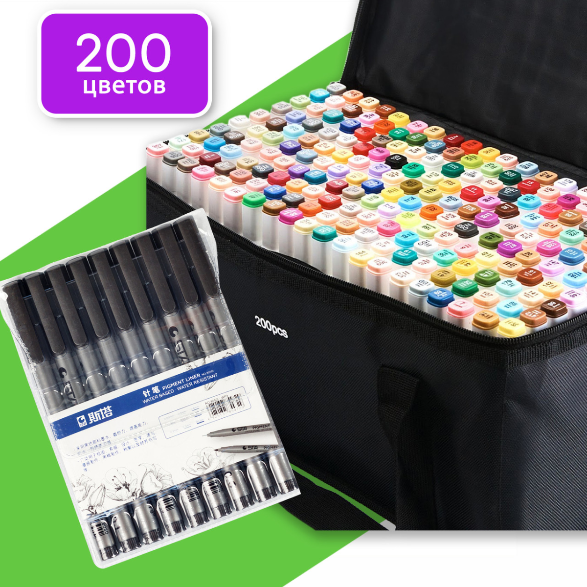 Ви купуєте Набір двосторонніх маркерів Touch Smooth для скетчинга на спиртовій основі 200 шт і разом з ними отримуєте набір якісних лайнерів 9 шт. різного діаметру від 0.05 мм до 0.8 мм і пензлики Brush.
