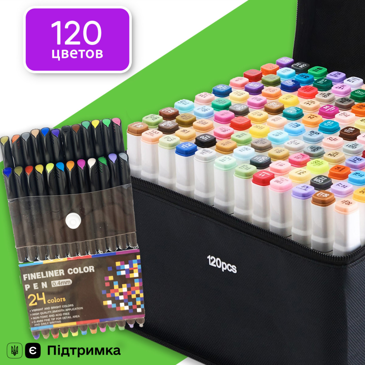 Ви купуєте Набір двосторонніх маркерів Touch Smooth для скетчинга на спиртовій основі 120 штук і разом з ними отримуєте набір якісних лайнерів 24 кольору діаметром 0.4 мм