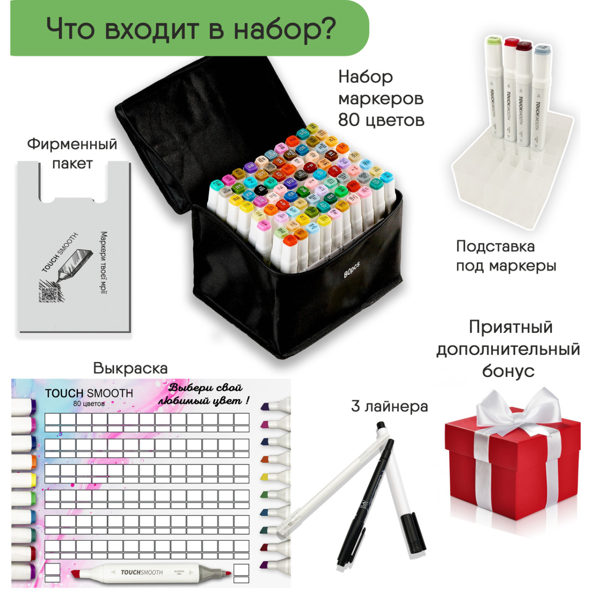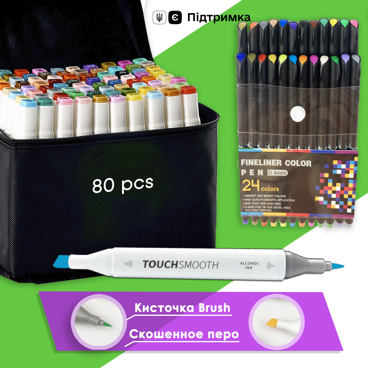 Ви купуєте Набір двосторонніх маркерів Touch Smooth для скетчинга на спиртовій основі 80 штук і разом з ними отримуєте набір якісних лайнерів 24 кольору діаметром 0.4 мм