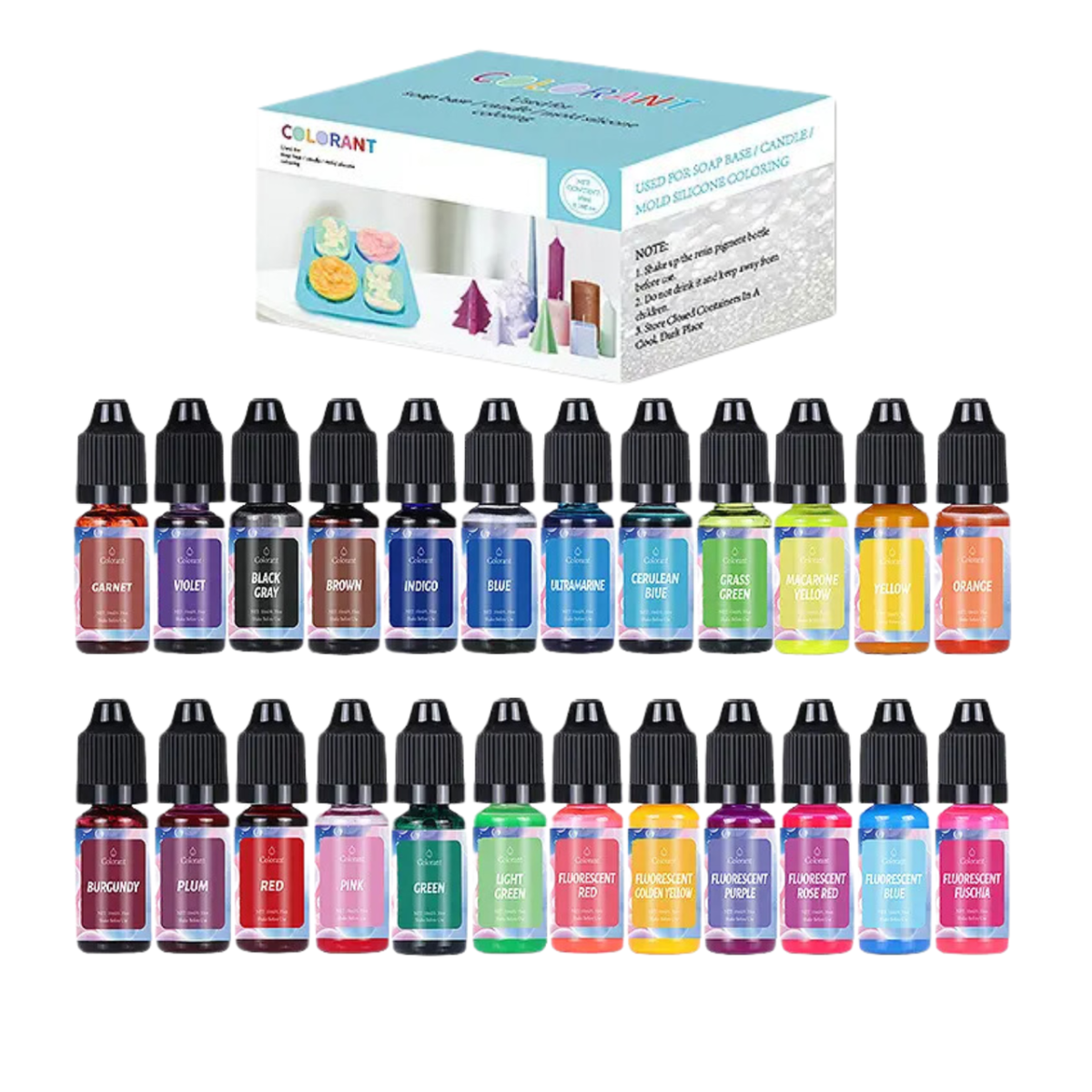 Набір рідких барвників, 24 насичених кольори - ідеально підійде для самостійного виготовлення свічок, мила та інших креативних проектів. Лише кількох крапель достатньо, щоб пофарбувати виріб до бажаної яскравості. Ви самі регулюєте насиченість кольору. Барвник швидко розчиняється у всіх видах воску, парафіну та мильної основи, не осідає, не потребує тривалого розмішування. Барвник також ідеальний для мила. Він рівномірно розподіляється в мильній основі, створюючи чисті, яскраві відтінки без розводів і осадів. Підходить як для прозорої, так і для білої основи. Перед першим використанням просто проколіть або зріжте верх крапельниці. Також захистіть робочі поверхні, щоб уникнути фарбування. Барвник може випадати в осад, тому перед використанням його необхідно струшувати. Після додавання у віск або мильну основу ретельно розмішайте барвник протягом 1-2 хвилин для рівномірного фарбування. Наш барвник не призначений для фарбування гелевих свічок. У соєвому воску і білій мильній основі відтінки можуть бути менш яскравими, оскільки вони вже мають свою природну білизну. Характеристики: Тип: барвники рідкі для виготовлення свічок і мила Склад: пігменти та органічні олії Кількість: 24шт Об“єм: 10мл/шт