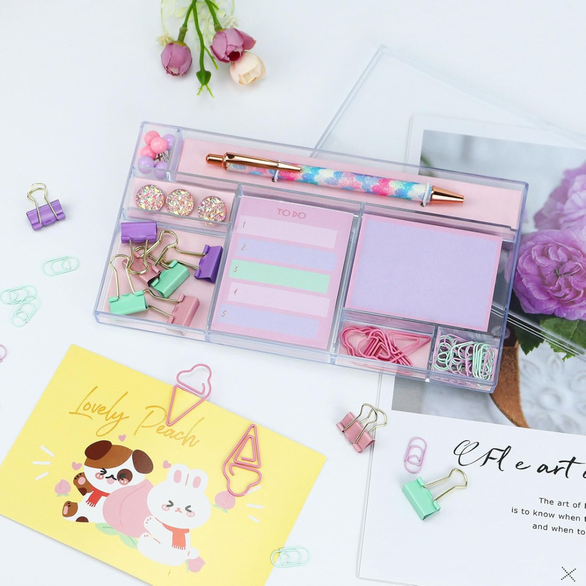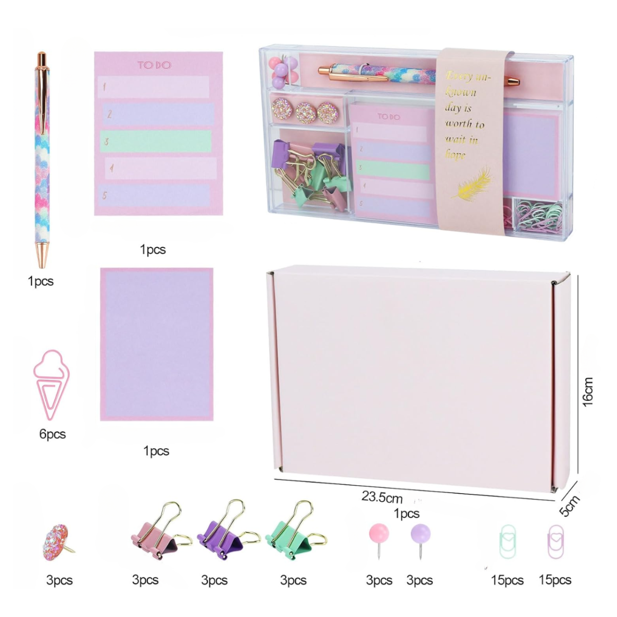 Подарунковий набір канцелярії ідеально підходить для навчання, роботи і творчості. У комплект входить оригінальна ручка, два блоки клейких листочків, дев“ять затискачів, 36 скріпок і дев“ять кнопок - усе необхідне для організації робочого простору. Набір поставляється в стильній подарунковій коробці, що робить його чудовим подарунком для школярів, студентів та офісних працівників. Клейкі листочки виготовлені з високоякісного паперу, зручні для записів, а металеві затискачі та скріпки міцні та довговічні. Зручний формат дозволяє легко носити приладдя в сумці, а акуратне зберігання в акриловому боксі забезпечує порядок і комфорт у використанні. Цей барвистий комплект надихає на навчання і роботу, а також стане стильною прикрасою робочого столу. Характеристики Матеріал: папір, пластик, метал, акрил Колір: різнокольоровий Комплектація: ручка, 2 блоки клейких листочків, 9 біндерів, 36 скріпок, 9 кнопок Розмір: 23x16x5см Вага: 500гр