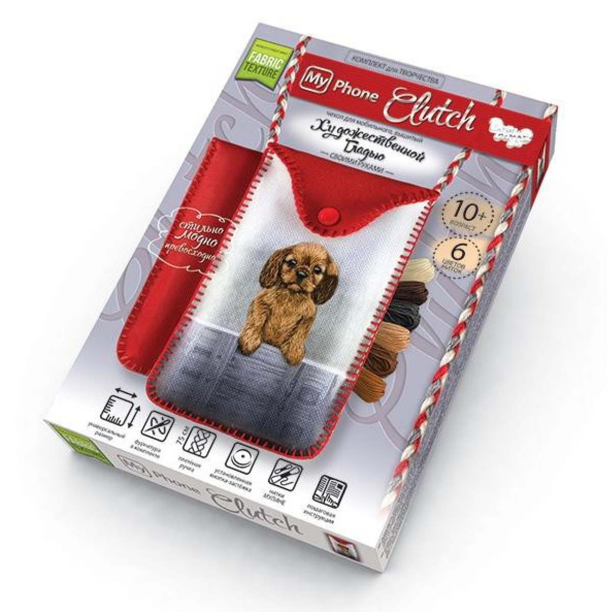 У комплекті: 1 схема-заготівка з малюнком вишивки з кнопкою, 1 полотно для зворотного боку чохла з кнопкою,  комплект різнобарвних ниток муліні, 1 голка, інструкція.