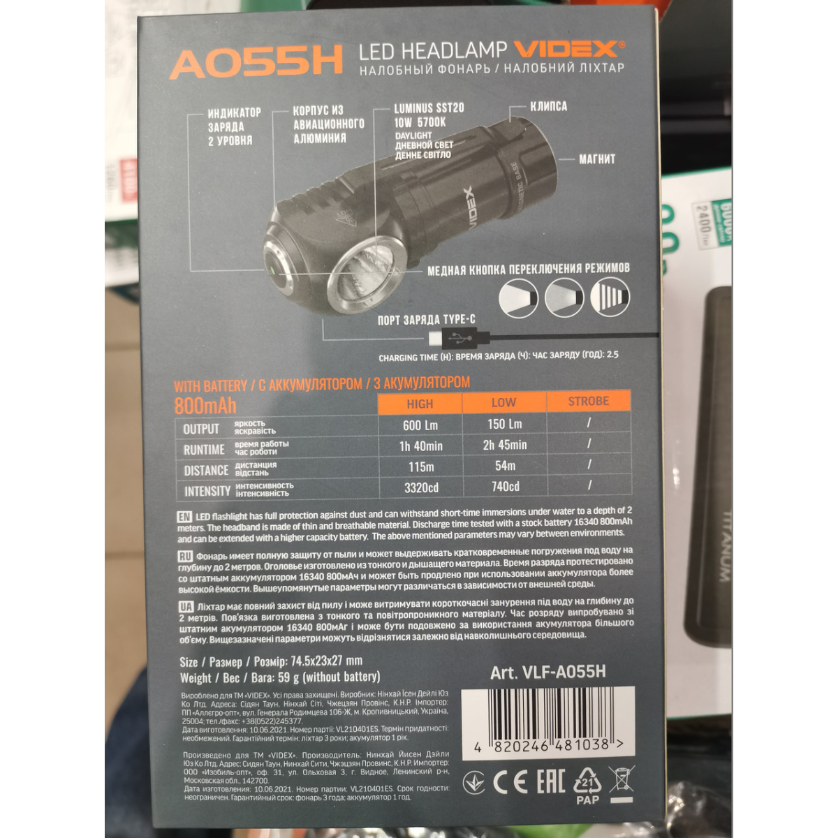 Портативний світлодіодний ліхтарик Videx A055H 600 Lm 5700 K, знімний акумулятор 16340 800mAh